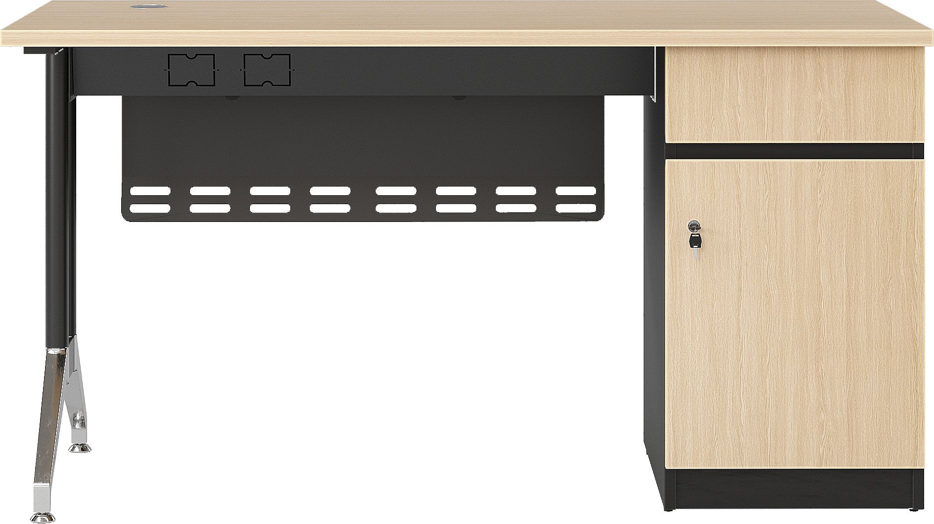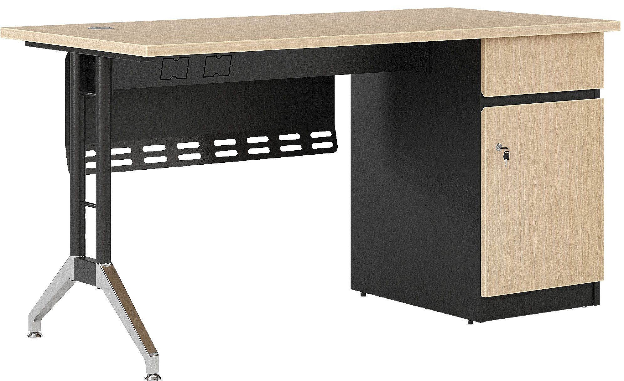 Bàn chuyên viên hộc liền cao cấp mặt gỗ meleamin, có yếm tôn, kết hợp chân bàn ống thép sơn đen và mạ. Bàn có máng điện kết hợp làm khung giằng với kết cấu chắc chắn và tiện ích khi sử dụng. Hộc liền gồm 1 ngăn kéo và 1 cánh mở, sử dụng tay nắm vát cạnh và có ổ khóa.