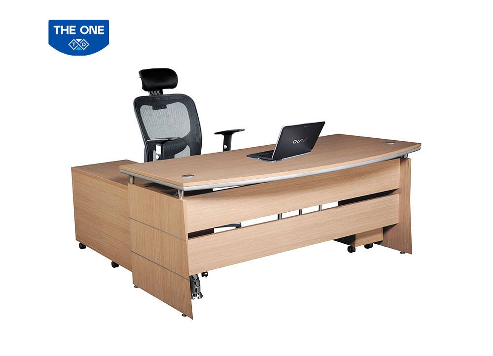 Bàn lãnh đạo gỗ Melamine, mặt bàn lượn cong có ốp gỗ sơn trang trí ở phía dưới.