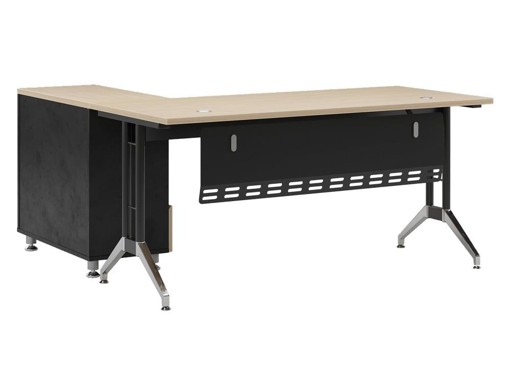Bàn trưởng phòng cao cấp mặt gỗ meleamin, có yếm tôn, kết hợp chân bàn ống thép sơn đen và mạ. Bàn có máng điện kết hợp làm khung giằng với kết cấu chắc chắn và tiện ích khi sử dụng.