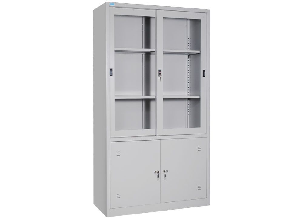 Tủ sắt sơn tĩnh điện 2 khoang: Khoang trên có 2 đợt di động và khung cánh kính lùa. Khoang dưới có 2 cánh sắt mở.