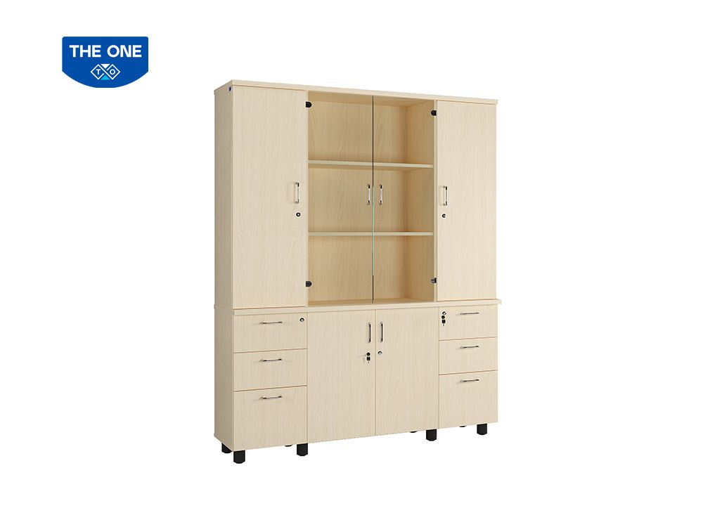 Tủ văn phòng 4 buồng, khoang trên có 2 cánh kính giữa để tài liệu, hai bên cánh đặc.