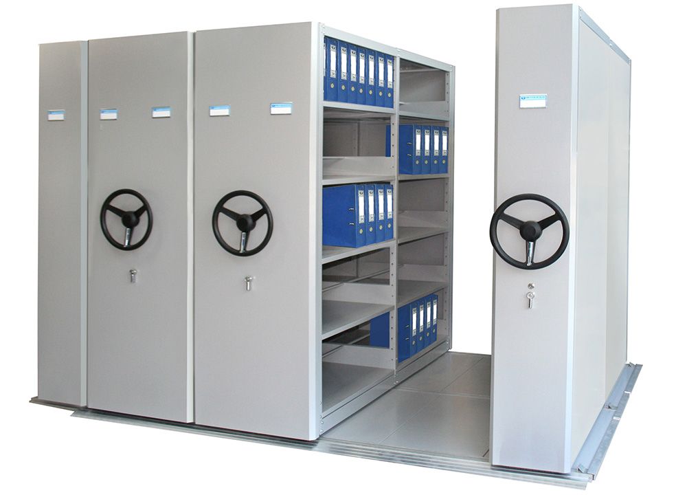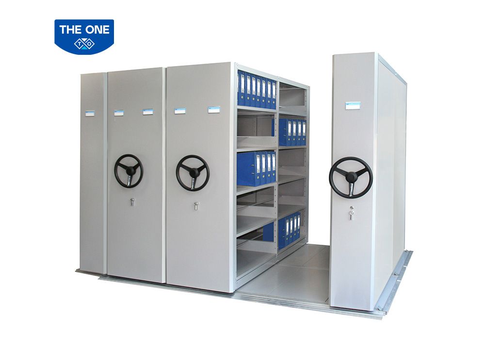 Tủ hồ sơ di động điều khiển chuyển động bằng cơ cấu ray và bánh xe. Mỗi tủ gồm hai dãy gồm dãy cơ bản và dãy nối tiếp.
